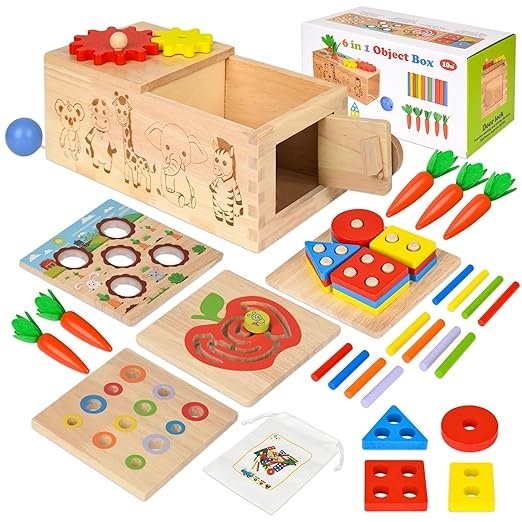 6 in 1 Wooden Play Kit Montessori Toys – Carrot Harvest, Shape Sorting and Stacking, Color Matchstick, Busy Board Object – Toddler Learning Toy for Kid Age 1, 2, 3 Year Old, Girl Boy Gift 12+ Months