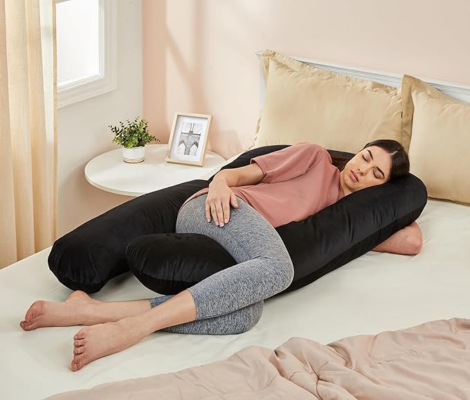 Amazon basics Full Body U-Shaped Pregnancy Pillow for Maternity & Baby Nursing | Abdomen, Hip, Spine, Neck & Head Support Cushion Velvet Outer Cover with Zip (Black)