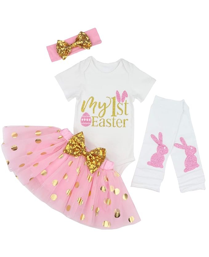 Easter Outfit Baby Girl, Letter Printed Long Sleeve Romper + Tutu Dress + Leg Warmers + Headband 4Pcs Set