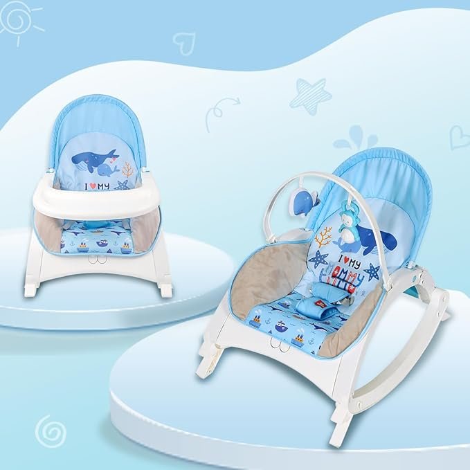 INFANTSO Baby Rocker & Bouncer for 0 to 2 Years (Blue), Chair for Newborn with Neck Pillow, Calming Vibrations, Music & Toys, 3 Position Adjustable Backrest Swing with Feeding Tray
