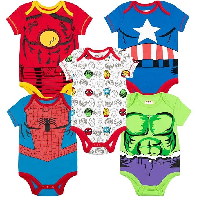 Marvel Baby Boys’ 5 Pack Onesies – The Hulk, Spiderman, Iron Man and Captain America (3-6 Months)