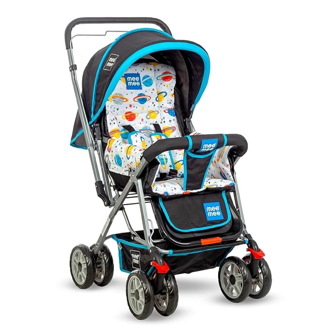 Mee Mee Little Explorer Advance Baby Stroller/Pram for 0 to 3 Years, New Born/Kids, 5 Point Safety Harness, Adjustable backrest, 360 Wheel, Large Storage Basket, Reversible Handlebar Net (DX Blue)