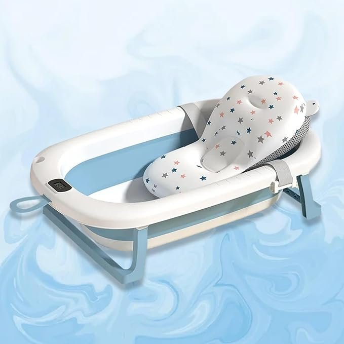 Safe-O-Kid Baby Bath Tub with Digital Meter, 1 Year Warranty, with Support Cushion Drain Plug, Portable/Foldable Travel Friendly Anti-Skid Collapsible Bathtub, Easy to Store for Newborns Bathing – Blue